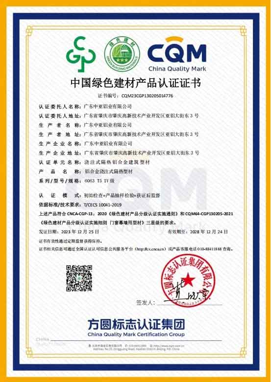 廣東中亞鋁材隔熱型材達到中國綠色建材產品三星級要求